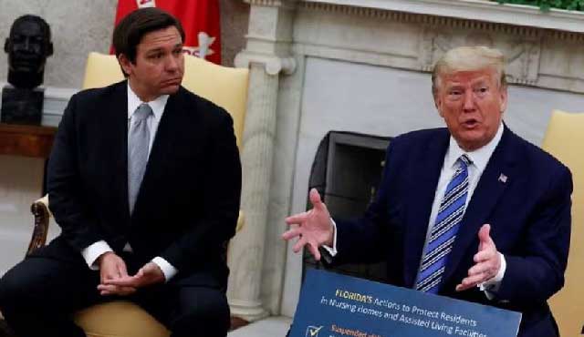 ২০২০ সালে হোয়াইট হাউসের ওভাল অফিসে তৎকালীন প্রেসিডেন্ট ট্রাম্পের সঙ্গে করোনাভাইরাস প্রতিক্রিয়া কৌশল নিয়ে বৈঠক করছেন ফ্লোরিডার গভর্নর রন ডিস্যান্টিস। ফাইল ছবি: রয়টার্স
