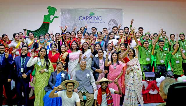 ক্যাপিং অনুষ্ঠান শেষে ড. ইউনূসের সঙ্গে সাংস্কৃতিক অনুষ্ঠানে অংশগ্রহণকারী শিক্ষার্থীরা। ছবি: সংগৃহীত