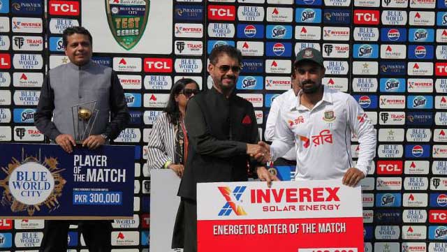 প্রথম ইনিংসে ২১৮ রানে দলের ৫ উইকেট পড়লে খেলতে নেমে মুশফিকুর রহিমের সঙ্গে গড়েন ১১৪ রানের জুটি। তৃতীয় দিন শেষ বিকেলে নাসিম শাহর এক ওভারে ১৮ রান তুলে স্পর্শ করেন ফিফটি, ছক্কায় হারিয়ে দেন বলও। পরের দিন নেমে ইনিংস যদিও বড় করতে পারেননি। তবে সব মিলিয়ে তার সামগ্রিক উপস্থিতি ও অবদান ছিলো চাঙ্গা করার মতন। সেই হিসেবেই তাকে এনার্জেটিক প্লেয়ার অব দ্য ম্যাচের পুরস্কার হিসেবে পাকিস্তানি এক লাখ রুপি তুলে দেওয়া হয়। এই অর্থই তিনি দান করলেন বন্যায় আক্রান্ত মানুষকে।