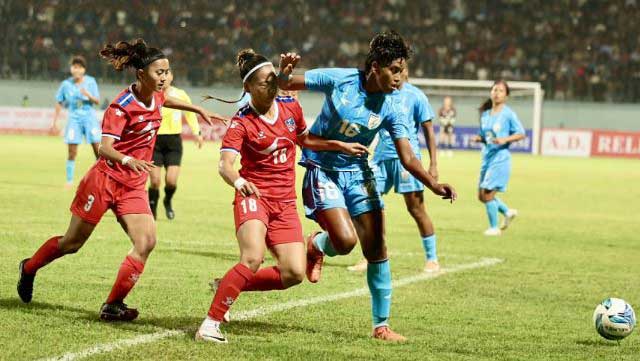 দ্বিতীয়ার্ধে সঙ্গীতা বাসফোরের লক্ষ্যভেদে এগিয়ে গেল ভারত। এরপর ভুটানের রেফারি ওম চকির সিদ্ধান্তের প্রেক্ষিতে তৈরি হলো তীব্র নাটকীয়তা। নেপালের একটি গোল বাতিল হওয়ায় প্রতিবাদ জানিয়ে দর্শকরা নানা জিনিসপত্র নিক্ষেপ করতে লাগলেন মাঠে। এতে এক ঘণ্টার বেশি সময় বন্ধ থাকল খেলা। ফের চালু হওয়ার দুই মিনিটের মধ্যে সমতা টানলেন নেপালের সাবিত্রা ভান্ডারি। এরপর উত্তেজনাপূর্ণ লড়াই গড়াল টাইব্রেকারে। সেখানে ভারতকে হারিয়ে সাফ নারী চ্যাম্পিয়নশিপের ফাইনালে উঠল নেপাল।