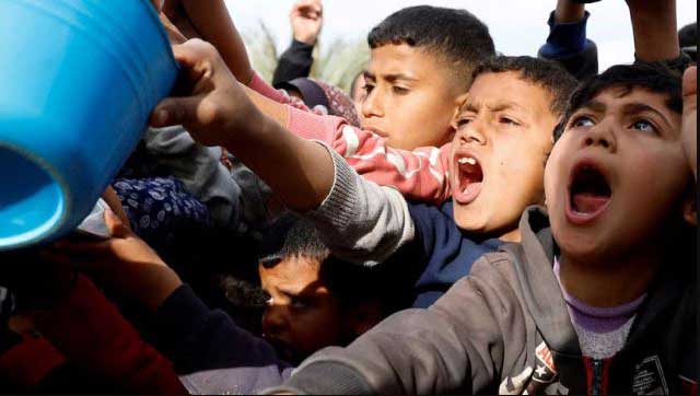 গাজার খান ইউনিসে ত্রাণের অপেক্ষায় ফিলিস্তিনি শিশুরা। ছবি: রয়টার্স