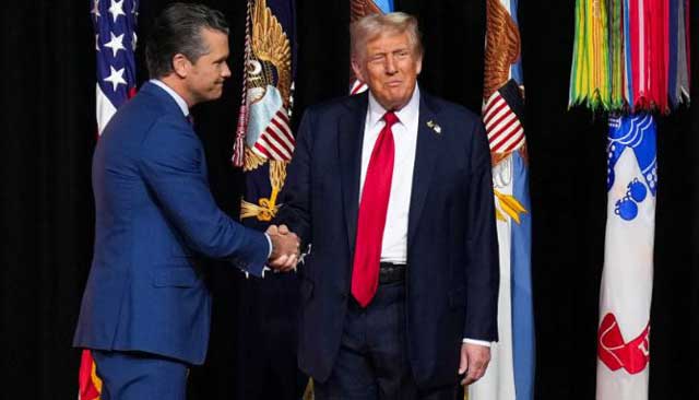 সেনা কর্মকর্তাদের সঙ্গে বৈঠকের আগে প্রতিরক্ষামন্ত্রী হেগসেথের সঙ্গে হাত মেলান ট্রাম্প। ছবি: রয়টার্স